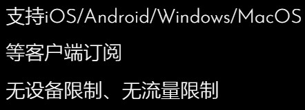 Windows客户端全面支持Win11、Win10、Win8、Win7等操作系统免费下载 Android客户端全面支持基于Android13、12、11、10、9、8等相关系统免费下载 MacOS客户端正在开发中,注册后复制订阅链接在第三方客户端使用现在注册白嫖 iOS客户端正在开发中,注册后复制订阅链接在第三方客户端使用现在注册白嫖 全平台客户端 极速网络 高可用性 安全无忧
